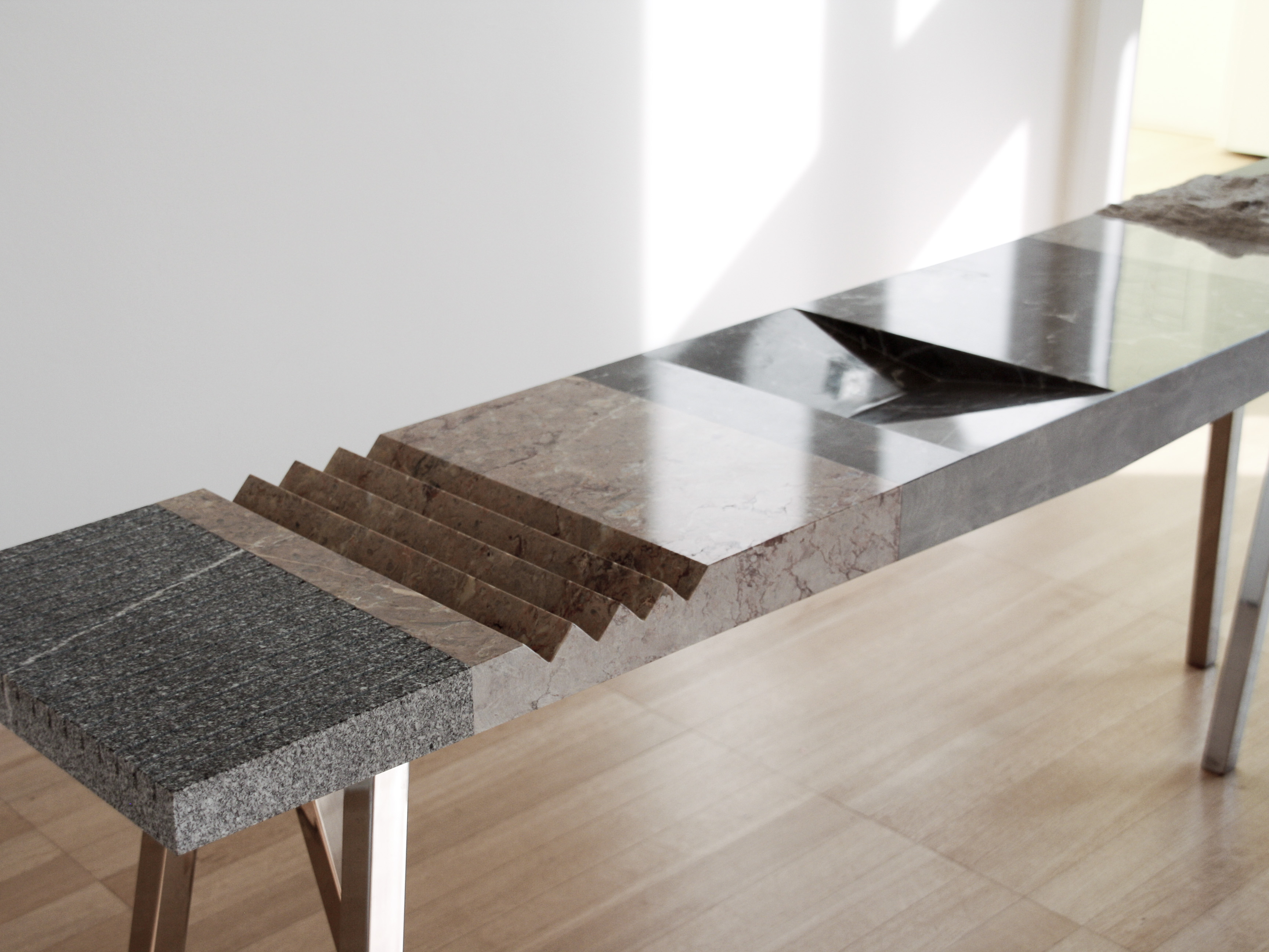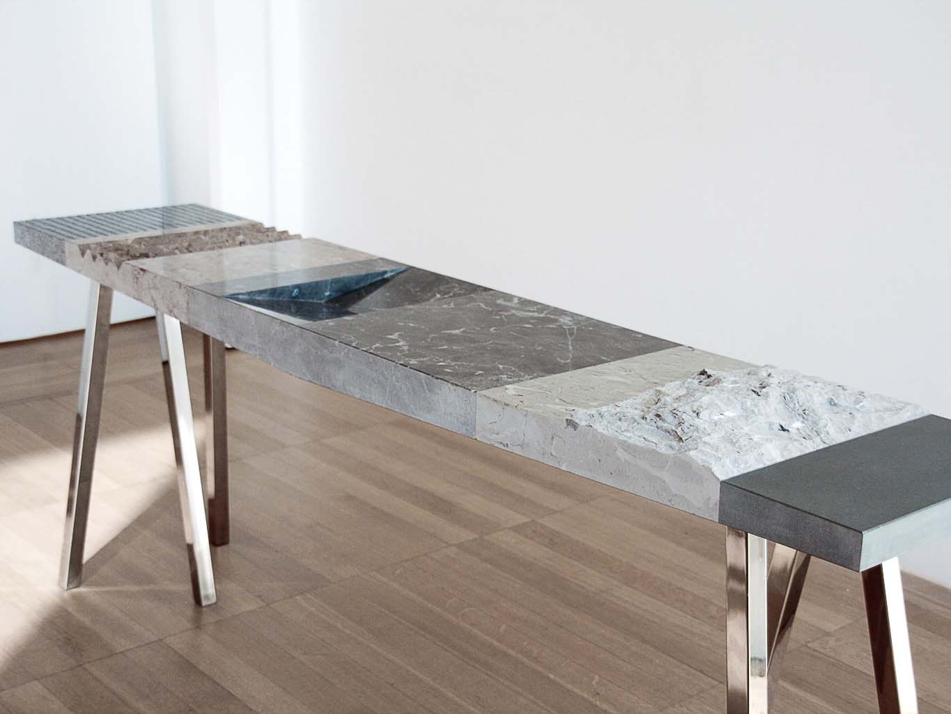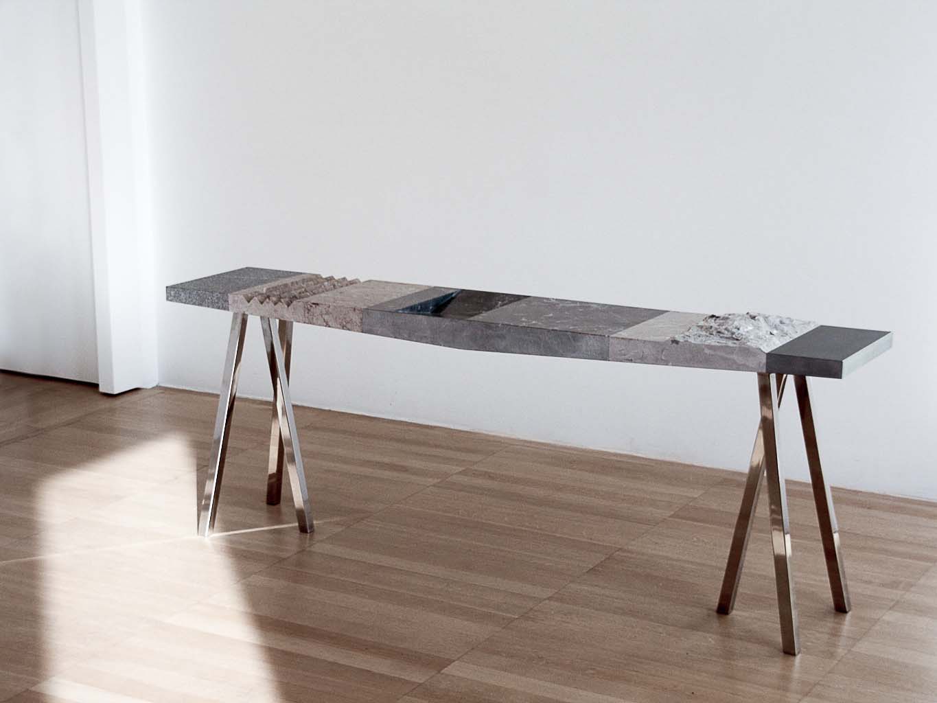 The sidetable KAMNINE was designed for BIO 50 - 24th Biennial of Design Ljubljana 2014 in close collaboration with the local stone mason Beno Ogrin. The sideboard is made from various types of natural slovene stone. It can be seen as a cross section through Slovenia's stone landscape on one hand but also through the craft of stonemasonry on the other hand.